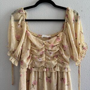 LUSH Yellow Floral Ruched Puff Sleeve Mini Dress M