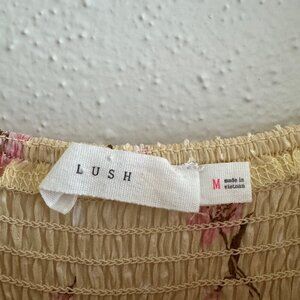 Sweet and feminine LUSH floral mini dress in a soft yellow with pink rose print. Features ruched bust, puff sleeves with tie detail, and a smocked back for a flattering fit. Lightweight and lined — perfect for brunch, garden parties, or a casual date night! Excellent condition.