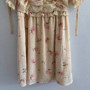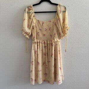 lush yellow floral mini dress ruched puff sleeve smocked back cottagecore romantic spring summer garden party dress size medium