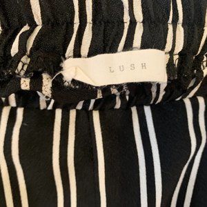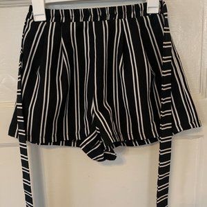 LUSH blakc and white pinstripe shorts. High-waisted, elastic waist with ties. 100% polyester. No flaws. Comfy and cute!
