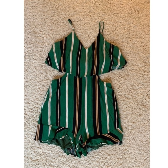 Super cute adjustable spaghetti strap green striped romper! 100% rayon. Worn maybe 3x, popover top with sides cutout. Lined. Super lightweight and comfortable. Easy to dress up & down! Zipper in back, super flattering. great condition! True to size (s/m)