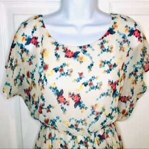 LUSH Floral Backless Chiffon Dress Faux Wrap Back Ivory Cream Size Small. Faux wrap back very low. Stretchy elastic waist. Short dolman sleeves. Lined. Gently used excellent preowned condition. See last photo for how i do measurements they are apprx and on one side.