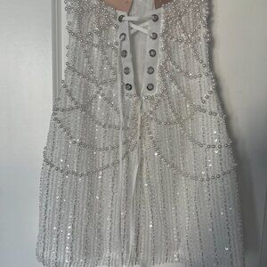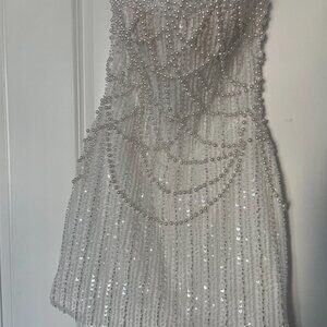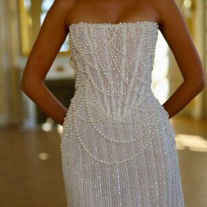Worn once for my wedding, cleaned, and it is in excellent condition. No stains, tears, I personally could not find any lost beading, etc.
