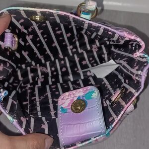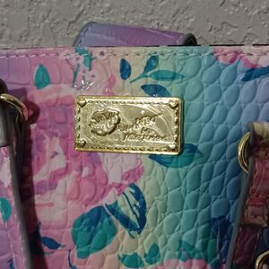 Charming LUV BETSEY BY BETSEY JOHNSON rainbow floral print crossbody with croc texture and matching card holder. Features three slip in pockets in the bag and 3 card slots on the holder. EUC, but missing crossbody strap. Collab with DOLLS KILL