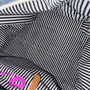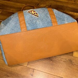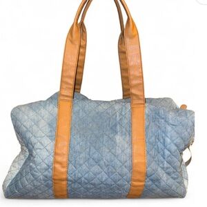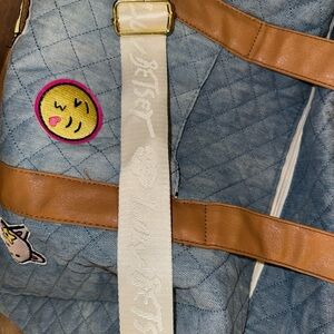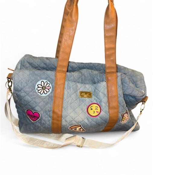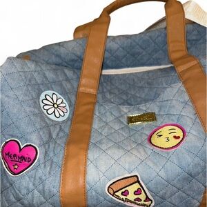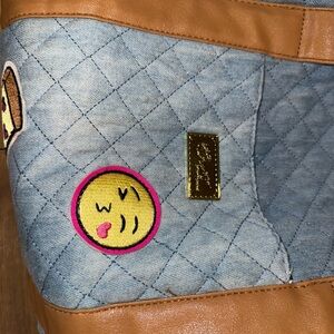 This chic quilted denim tote bag features playful patches and elegant brown accents. Perfect for adding a touch of fun to your everyday look.