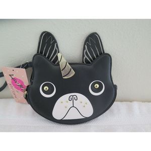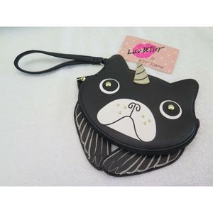 LUV BETSEY Black Frenchie Bulldog Unicorn Coin Purse Wristlet With Wings