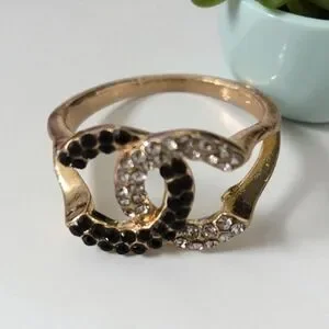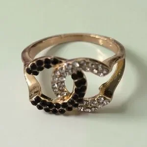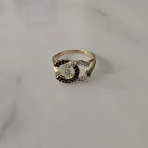 This elegant gold and black ring features a stunning design with sparkling accents. Perfect for adding a touch of sophistication to any outfit.