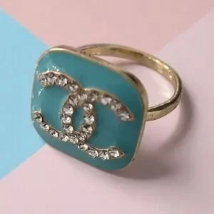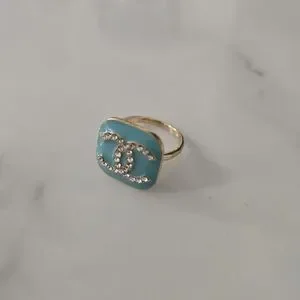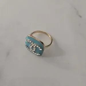 This stunning designer ring features a beautiful blue enamel with sparkling accents, set in a luxurious gold band. Perfect for adding a touch of elegance to any outfit.