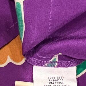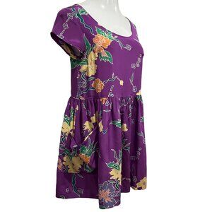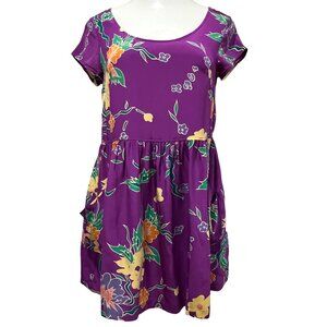 Lightweight pullover babydoll style mini dress features front patch pockets, scoop neck, and cap sleeves. Silk purple floral, excellent condition. The dress could also be worn as a tunic top over leggings. Size M