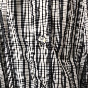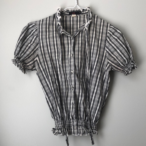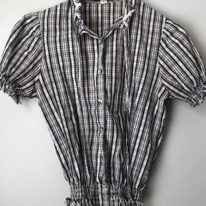 Cinched waist blouse. Very small yellow dot on one button. Not noticeable.