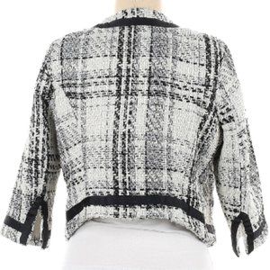 GUC LUXE by Arden B. blazer. Cropped style, 3/4 sleeves with vents, lined. Fabric: 90% polyester, 10% wool, lining 100% polyester. Color: black and white plaid pattern with black ribbon trim. Size: medium.