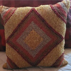 Geometric pillow done in shades of burgundy, gold and taupe all coming together to create a show stopping accent pillow. Gently used for a short time. Purchased at Neiman Marcus.