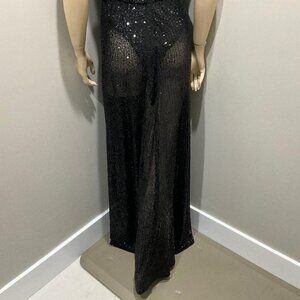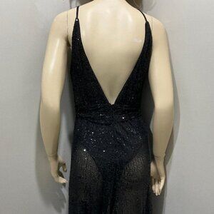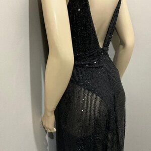 LUXXEL Black Sequin gown, high-slit & sexy deep v-neck front & back NWOT sz S