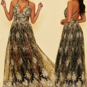 LUXXEL SZ S black gold glitter backless strappy formal maxi dress gown NWT B162