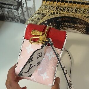 Stylish Louis Vuitton shoulder bag. Clear body with pink accents. Iconic monogram strap. Perfect for any occasion.