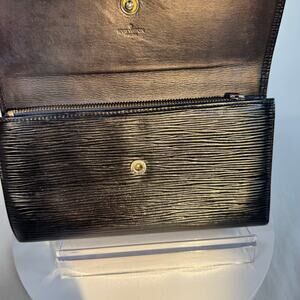 LV’s iconic Epi leather wallet - at an affordable price! The leather on this wallet is soft with a ton of life left. I used professional leather dye to take it from blue to a lovely black. I also had the zipper pull replaced. It is now ready for it's new life with you. A nice simple statement piece. Wallet is in excellent condition.