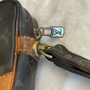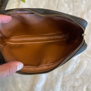 This vintage LV clutch is the ideal bag. It’s large easy opening zippered top allows for an expansive space of carrying. The wristlet itself is on a swivel allowing it to spin easily as you hold it on your wrist.