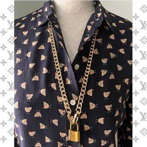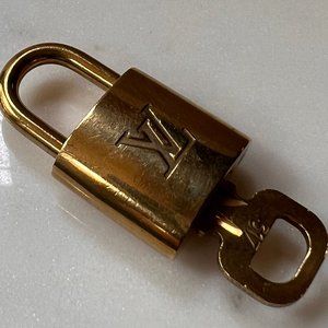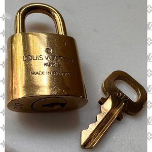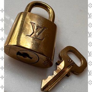Louis Vuitton vintage luggage Lock with Key #317 with unbranded gold toned curb chain. Unbranded chain measures 10mm wide x 31 inches long. Lock is approximately 1 inch tall x 3/4 inches wide. See photos for condition of lock, lock works with key. Excellent vintage condition.