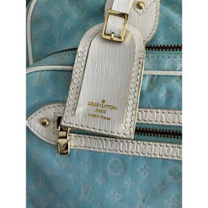 LOUIS VUITTON Mini Lin Sac a Langer Diaper Bag crafted of blue monogram mini lin canvas, which is 58% cotton, 24% linen, and 18% polyamide. The bag features a white cowhide leather trim and brass hardware. The bag has dual bottle pockets at sides, three exterior pockets, three interior pockets and dual elastic loop holders at sides, dual adjustable flat handles and protective feet at base.
