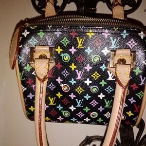 The bag in the image is a Louis Vuitton Speedy, specifically the Mini Speedy version from the collaboration with Japanese artist Takashi Murakami.