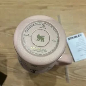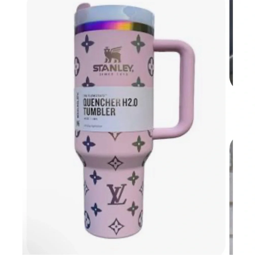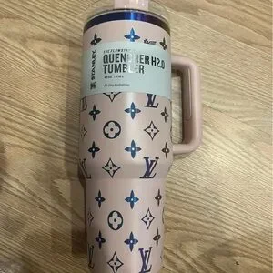This is a new LV Stanley Quencher H2.0 Tumbler, still in its original box with tags. Only removed for pictures. The tumbler is pink and features a pattern of dark blue Louis Vuitton-inspired logos. It has a handle, a lid with a straw opening, and a straw. The tumbler is made of stainless steel with a powder-coated finish.