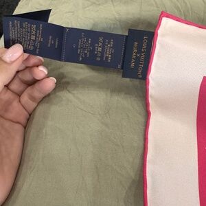 This stylish scarf is crafted of 100% silk and features the Louis Vuitton monogram on a light pink background and an overlay of Takashi Murakami playful cherry blossoms throughout. This versatile piece can be worn in the hair, around the neck, or as a decorative bag accessory.