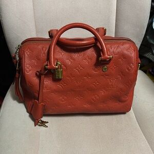 Louis Vuitton speedy 25 with adjustable crossbody strap and matching wallet. The bag is in excellent condition, no scratches, rubbings, color transfer or funny smells. Still has original lock and keys. This is a soft bag, it doesn’t have a lot of structure to it. The wallet does show wear. It has some darkening on both sides and along the corners, see pictures. The zipper still works great and the inside is very clean. These will include a box and dustbag for the speedy. These come as a bundle.