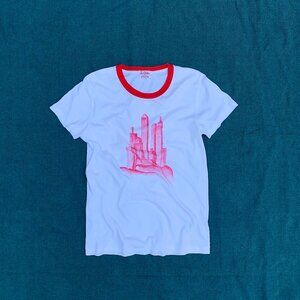 Reminiscent of Gotham City, our favorite dystopian metropolis. This cool, unconventional "high risers on hand" print showcases LVC Levi's Vintage Clothing graphic designing skills. Made of 100% soft cotton, the tee shirt has an architectural, Art Deco, American 30's Comic vibe. Measures 25" length, armpit to armpit 17.5", excellent condition.