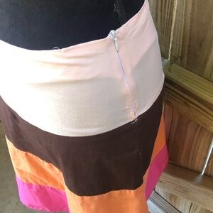 Level 10 Skirt with Colorblock Wide Bold Stripes in Peach, Brown, Orange & Pink. Hidden Side Zip Closure. Lightweight / Unlined. (Has No Stretch) Made in USA.