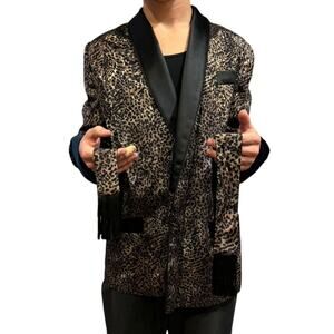 Striking vintage-style L.W. Wardy leopard jacquard smoking jacket in size XS. Made in the USA, this piece features a silky rayon/poly blend with a bold leopard pattern, smooth satin lapels, contrast satin trim, and a matching sash belt with tassel detail. Fully lined with a sleek black satin interior. One chest pocket and two front pockets. Elegant, dramatic, and perfect for loungewear, stage, photoshoots, or statement fashion. Clean with no flaws noted.