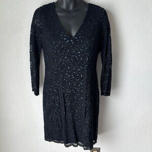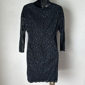 This dress is a dark navy blue and black lace. V neck. Similar to modeled pic, however this does not have a gathered detail at side. Only worn once so great shape. Size 14.