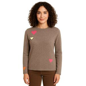 cashmere sweater, soft cashmere, multicolor hearts, heart pattern, L/LX brand, brown sweater, XS sweater, women's fashion, cozy knitwear, winter sweater, dry clean only, layering piece, cute sweater