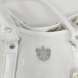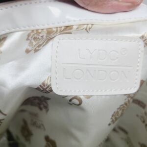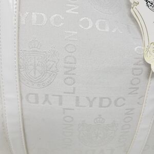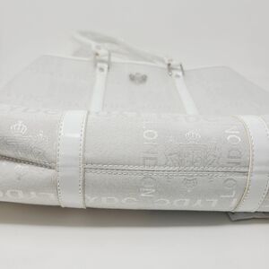 Grab this large white vintage tote bag or purse by LYDC London. Two large straps for easy carrying. White on white logo all over outside of bag; inside logo in gold. Inside the bag is a large zipper pocket and a few side fabric pockets. Faux leather trim and straps. Plenty of room for all your essentials! Bag is new with tags; slight smudge marks in places from storage. Plastic wrapping still on straps of bag. Please see close-up pictures for more details; bag is stuffed to show fullness.