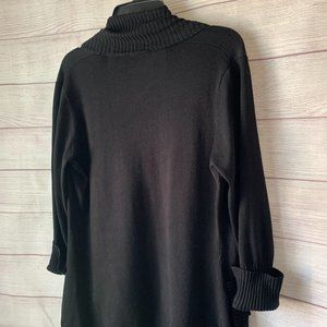 Black cardigan with open, tiered front and side pockets. The front, bottom, pockets, and cuffs are all ribbed. The cuffs are rolled and fixed with a stitch. The arems are 3/4 length. It is used but in good condition. There is one small snag/opening of the seam (see photo) that is not noticeable. By LYN brand.