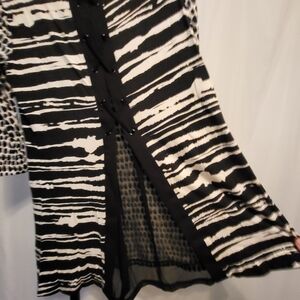 2 separate yet coordinating black and white patterns, oblong vertical shapes on the front and horizontal stripes on the back