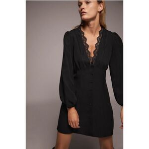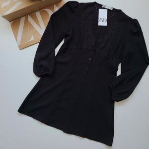 SHORT DRESS WITH V-NECKLINE WITH TONAL LACE TRIM. LONG SLEEVES WITH ELASTICIZED CUFFS. FRONT BUTTON CLOSURE.