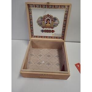 The La Aroma De Cuba Reserva Nicaragua cigar box is a collectible item made in Nicaragua. This wooden empty cigar box is a unique piece that holds historical value for cigar enthusiasts and collectors alike. With its distinctive design and country of manufacture, this cigar box is a fun item for those interested in tobacciana collectibles. You can also use it for storing items.