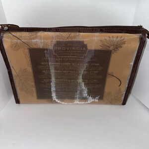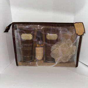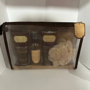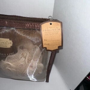 This La Bella Provinicia Coconut Lime Scented Body Care Set is new with tags and in its original packaging. The set includes shower gel, body lotion, body mist, and a bath pouf. All items are in a clear plastic cosmetic bag with a brown zipper. The bag is approximately 9x6 inches. The products are packaged in tubes and bottles with labels indicating the scent and volume. The pouf is a light beige color. No visible imperfections are present.