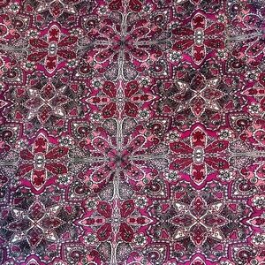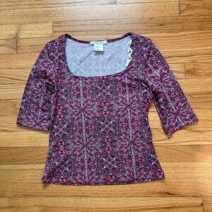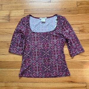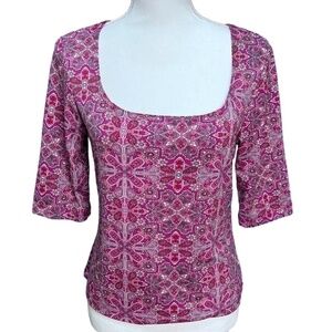 Y2K women's top with a square neckline. a vibrant pink and purple pattern. Three-quarter sleeves.