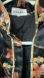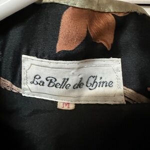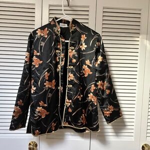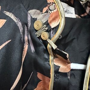 Truly beautiful print: black background with light amber, dark amber brown, and pale green floral. Pale green trim on body and sleeves. Bust darts, well tailored. Classic asian design with frog closures fortified with snaps for a great fit. There is no fabric tag but I feel confident it is silk exterior as well as silk lining. The lining is quilted with what feels like cotton for warmth and comfort. GORGEOUS!