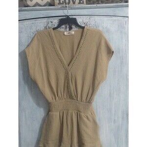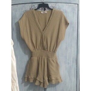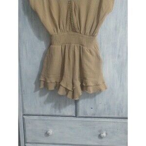 The La Biz V-neck Ruffled Romper in Beige is a feminine and boho-inspired piece perfect for a beachy or cottage core look. This one-piece romper features a flattering V-neck neckline with short sleeves and ruffle accents, adding a touch of bohemian flair. Made for women in a size medium, this pullover romper is versatile for all seasons and occasions. Perfect for a casual day out or a stylish evening event, this romper embodies a carefree and effortless style.