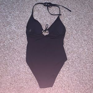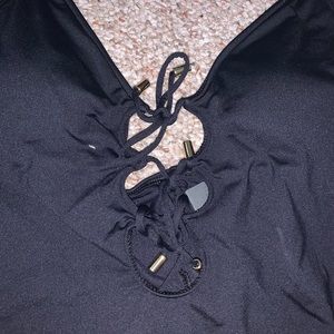 La Blanca Black One Piece Black Halter Swimsuit. Solid Black. Halter top with adjustable straps. There is a deep slit with three different adjustable straps with gold brass detailing that allows the swimsuit front to be more or less revealing. Size 8 is NWOT. Size 6 is NWT. Removable padding. See pictures for reference.