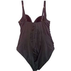 Elegant black one-piece swimsuit. Features ruched detailing and adjustable straps. Perfect for a chic beach look.