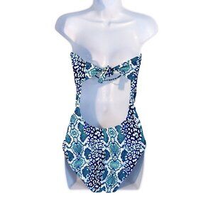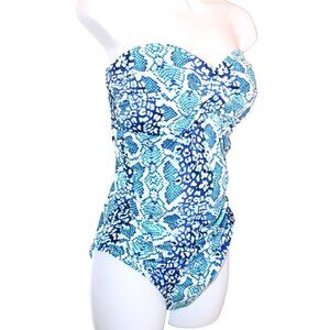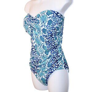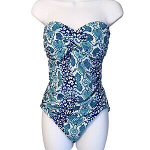 La Blanca Blue Green Snakeskin Strapless Swimsuit Size 12 Ruched One Piece Retro