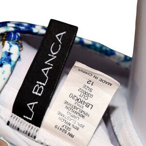 This La Blanca one-piece swimsuit makes a bold beachside statement with its snakeskin-inspired print in cool blue and green tones. Designed with flattering ruching and a sweetheart neckline, it offers structured support and an adjustable tie-back for versatile styling. Open back cutout adds a touch of retro glam. Size 12.