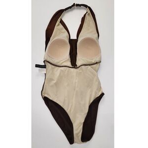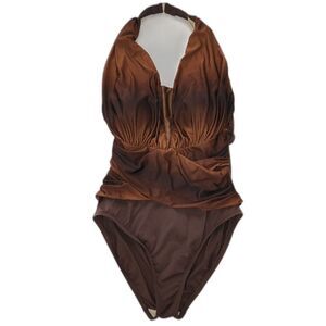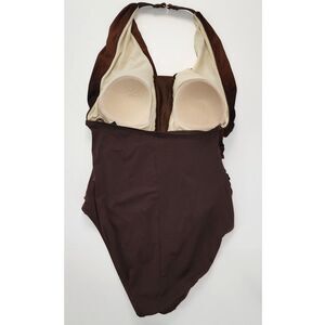 La Blanca Brown One-Piece Swimsuit Size 10. Super cute one piece swimsuit with ruched and criss crossed fabric for concealing tummy. Halter top style bathing suit with built-in pads. Great used condition with no holes or snags.