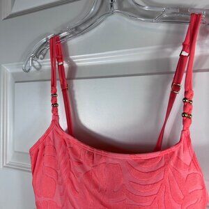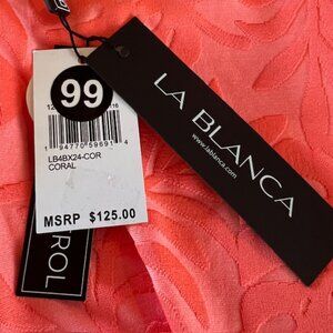 Make a bold statement at the pool or beach with this La Blanca coral jacquard one-piece swimsuit in size 12. Featuring a tropical textured leaf pattern, this swimsuit combines elegance and comfort with its sleek silhouette and adjustable straps for the perfect fit. The vibrant coral hue flatters all skin tones, while the high-quality fabric ensures durability and style. Perfect for resort vacations, summer getaways, or lounging poolside.