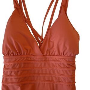 Wonderful suit for sun bathing or taking a swim. Horizontal bands beneath the sexy v-plunge neckline. Built-in tummy control panel smooths and slims. The fixed multi-strap cross-back design keeps thing firmly in place.