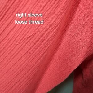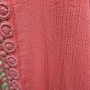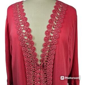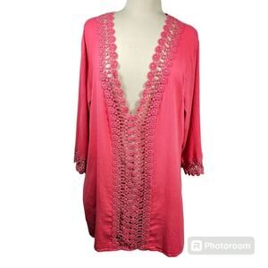 This is a pretty, coral, swimsuit cover-up in pre-loved, GUC. It is oversized to throw over your swimsuit when you're headed to the snack bar, running into a shop, or anytime you need to feel a little more covered. It is made in a gauze-like material and features crocheted lace around the sleeve cuffs and also lining the front of the pullover, from neckline to hem. There are a few loose threads here and there (see photos) but no holes or tears. Women's Size L.