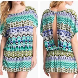 Draped dolman sleeves and drop-waist styling softly blouse the bodice of a beach-to-boardwalk cover-up brightened with hypnotic, digital chevron stripes, and finished with a flirty cut-out back.